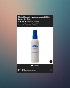 - Magic Molecule Hypochlorous Acid Spray: This spray is amazing. It helps to remove bacteria from your skin immediately and promotes healing while reducing redness. I use it after working out, for any cuts/scrapes, and for razor burn. If you have acne prone skin, you should already be using this! It’s also completely non-toxic, so you can use it on your kiddos, too.
